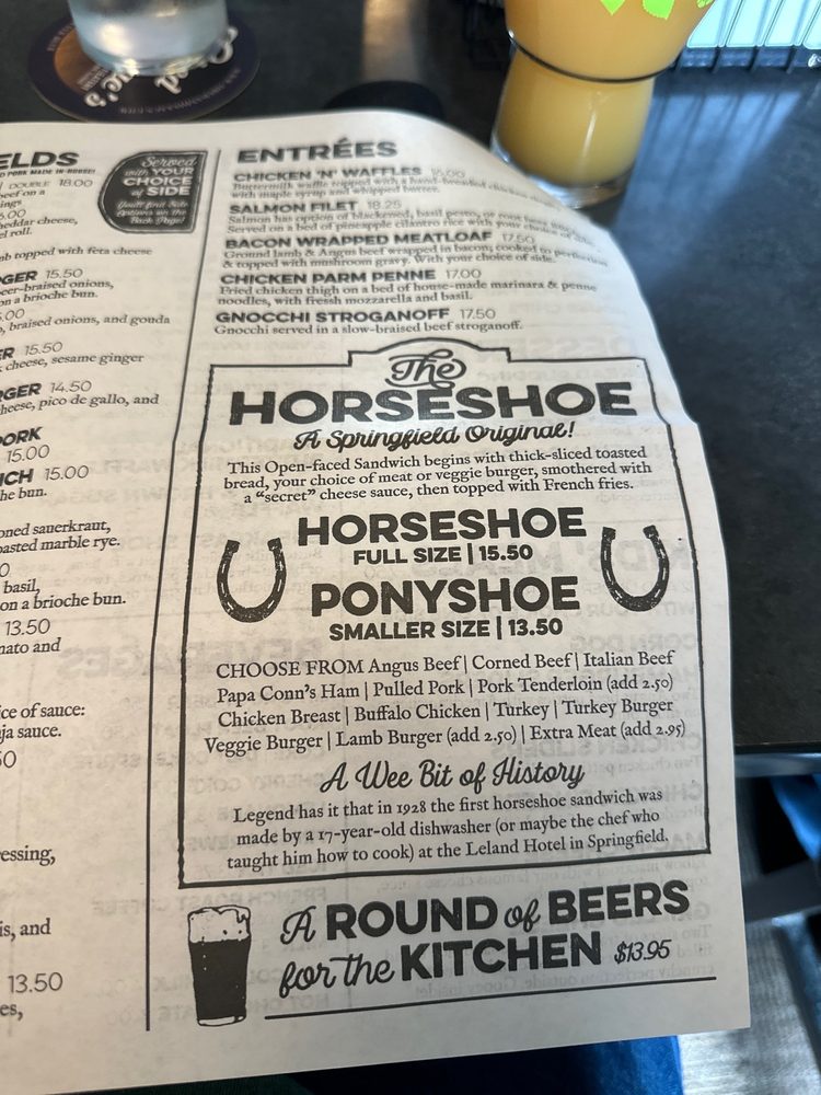 Open-faced sandwich begins with thick-sliced texas toast, your choice of meat, smothered in a secret cheese sauce, then topped with french fries. A Springfield Original.