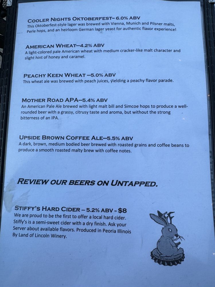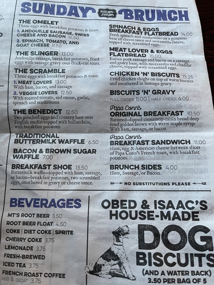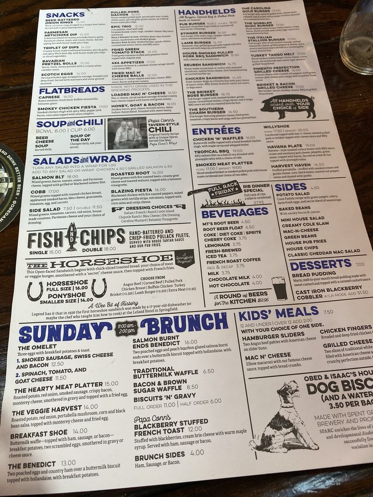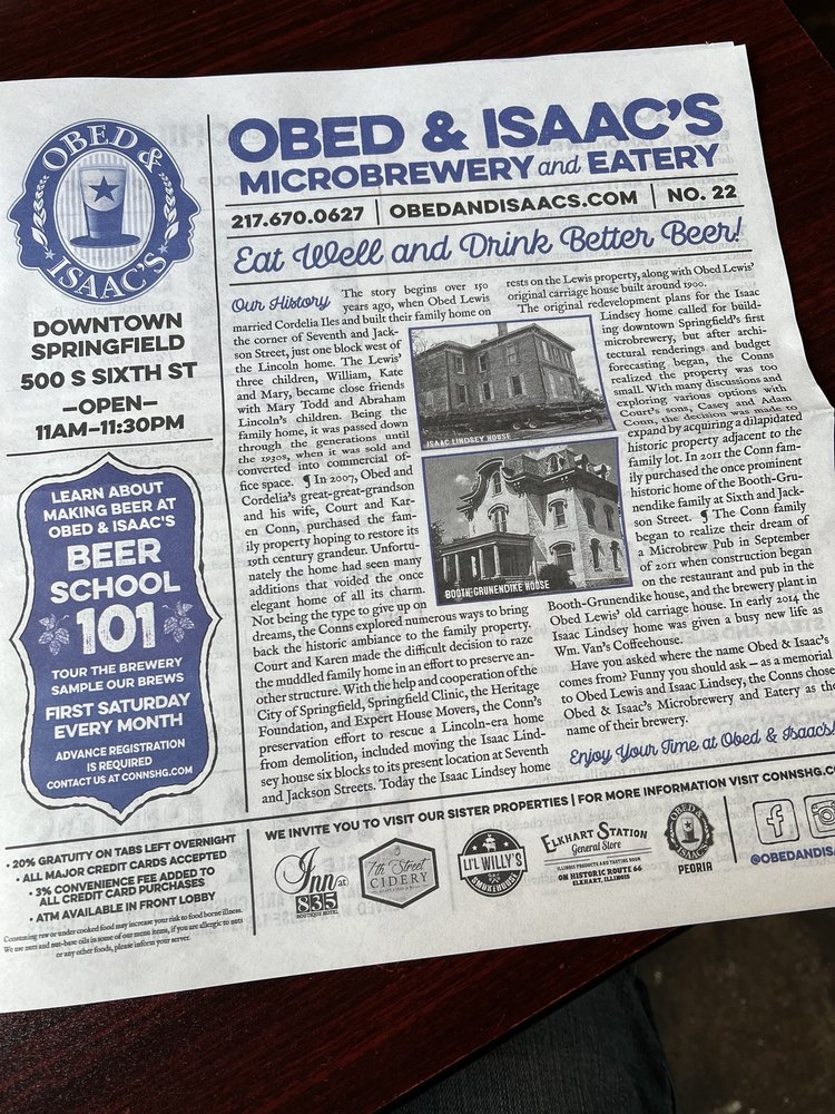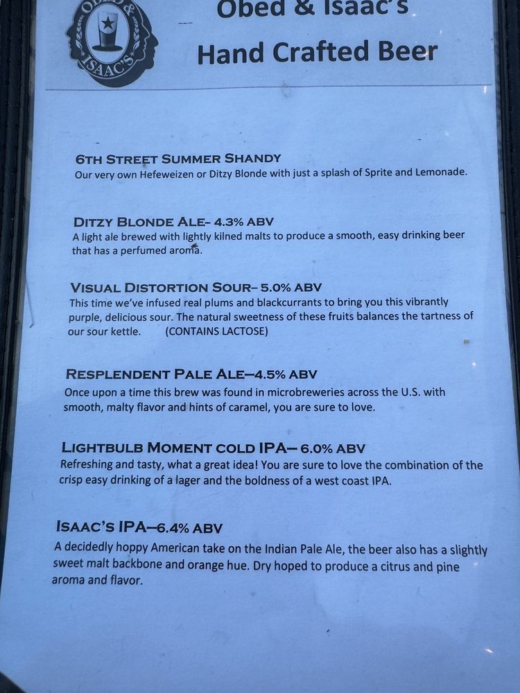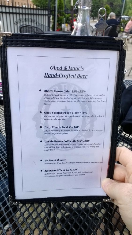 Introducing the menu at Obed & Isaac’s Microbrewery and Eatery, located in Springfield, IL. This family-owned establishment offers a wide range of dining options, including appetizers like Black and Tans onion rings and Parmesan Dip, as well as flavorful flatbreads such as the Margherita Chicken and BBQ Pork and Pineapple. Customers praise the relaxing atmosphere, friendly staff, and extensive beer selection. Popular dishes like the chicken taco pizza and honey, goat, and bacon flatbread receive rave reviews. The beer garden is spacious but lacks shade, yet the overall experience is enjoyable. With a focus on quality food and brewing their own beer onsite, Obed & Isaac’s is a must-visit for those looking to experience Springfield's history and hospitality.